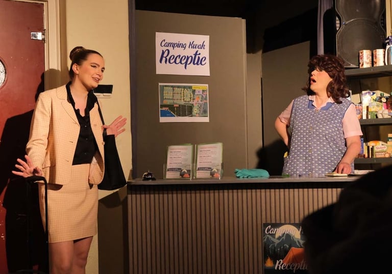 De bezoekers werden bij binnenkomst van de zaal uitbundig welkom geheten op camping Kwak door kleinzoon Peter Kwak (Arnold Knot) en schoonmaakster tante Toos (Frouwke Dijkhuis). De hele zaal was ingericht als camping, met een receptie, grote boom, een caravan op het podium en een toiletgebouw met stromend water en wc’s waar bouwvakker Piet (Laurens Groeneweg) regelmatig gebruik van maakte.